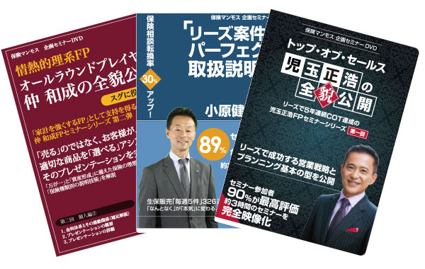 現在販売されている、山上雅史FP「【保障重視提案のコツ】保険相談 支持されるFPの流儀 Vol.1(税別42,000円)」、今村浩二FP「【納得を引き出す話法】リーズ案件のパーフェクト取扱説明書(税別42,000円)」から、リーズ案件・成功のコツの最重要ポイントを抜粋してお求めやすい価格(税別42,000円)でご紹介する、まさにリーズのバイブル。