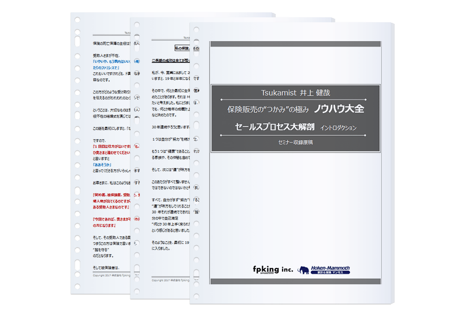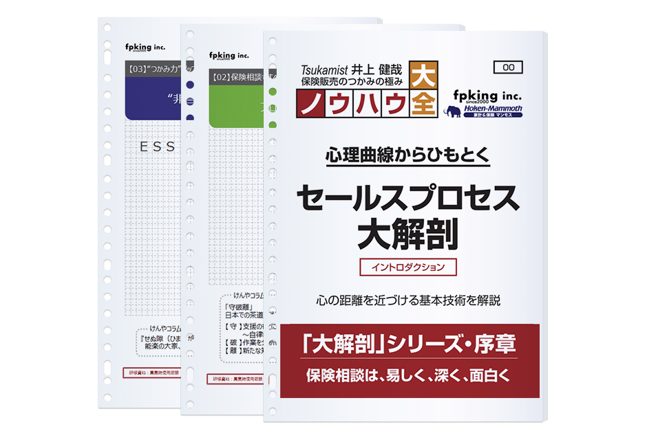 募集活動と講師活動でのハイパフォーマンスを長期間・安定的に残しているTsukamist井上健哉氏が、長い年月をかけ、練り上げた保険提案・成功のレシピを、全公開していく教材シリーズ!