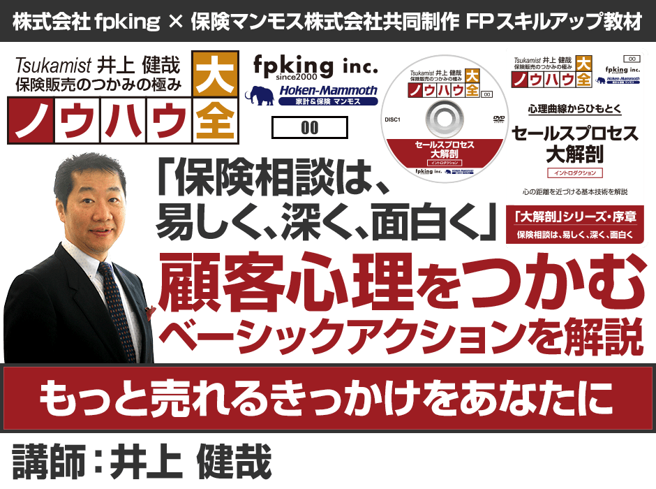 この教材では「理解できた、勉強になった、この人から買いたい」という、顧客心理をつかんだ保険相談にするための、アプローチからプレゼンテーションで即使える、“効く”ベーシックアクションを厳選してお届けいたします!