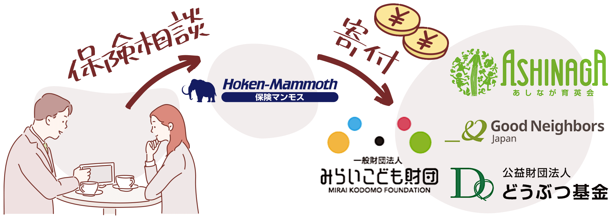 あなたと保険マンモスの想いを、必要としている人に届けたい。私たちは、無料保険相談を受けると自動的に社会貢献団体に寄付されるプログラムを始めました。