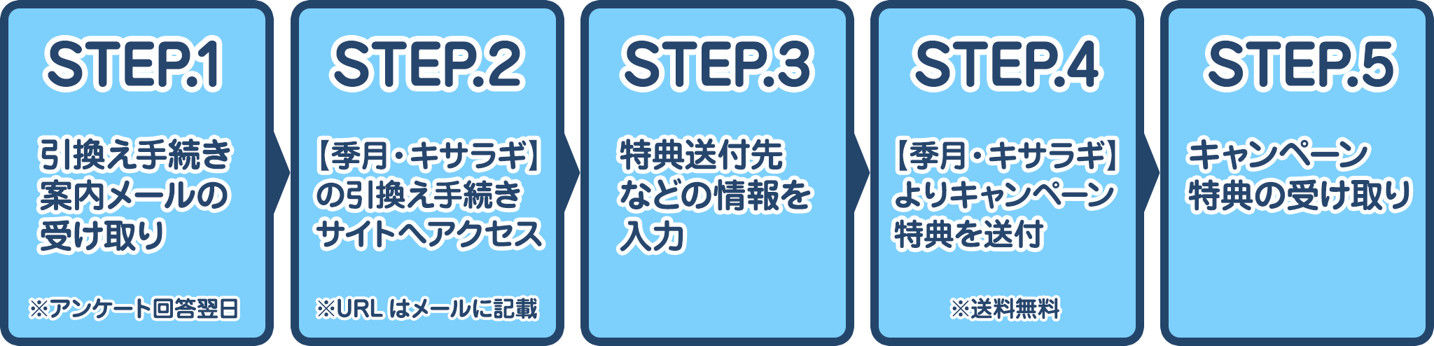 - 引換有効期限は引換え手続き案内メールの到着後3ヶ月です。【季月・キサラギ】の引換手続きサイトでお手続きください。3ヶ月を過ぎた場合の引換はお受け付けできません。